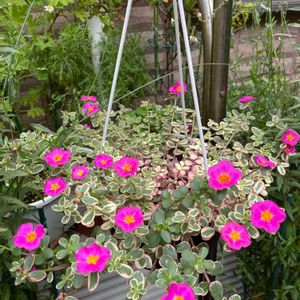 🍀夏のハンギング🍀 🌸ポーチュラカ マジカルキューティー🌸 去年のポーチュラカが冬越ししました✌️💕 葉は斑入り、もっと紅い色が入るはずなんだけどなぁ😅 カラーリーフを二種類入れてます❣️ アキランサス。。赤い葉 白い小さな花が見えます😳 アルテナンテラ。。パープル系銅葉艶やか✨ 成育が旺盛‼️ 簡単に挿し芽が出来て増える増える😆 そろそろ梅雨明けでしょうか⁈ 今日もよい一日をお過ごし下さいね💕