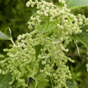 茎蒸(カラムシ) イラクサ科カラムシ属の多年草。道端や土手などに群生する。葉は広卵形で鋸歯があり互生し、裏面は綿毛が密生して白っぽく見える。花期は7~11月。茎の上方の葉腋に球状の雌花序、下方の葉腋に下垂する雄花序がつく。痩果は楕円形で先が尖り、全体に伏毛がある。 昔は茎を『から』といった。この茎を蒸して皮をむき繊維をとったのが名前の由来。カラムシは我が国最古の繊維植物であり、山口県下関市の遺跡より、紀元前300年の弥生時代のカラムシの繊維による布の断片が出土した。その後に麻やカジノ木も利用された。中世末期になってワタが渡来するまでは衣類の繊維材料であった。繊維は長く丈夫で、越後上布などの上質の織物原料として古くから栽培され、ロープや網にも使われる。 出典『里山の植物 ハンドブック』『散歩の草花図鑑』『薬草の呟き』