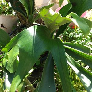 友だちからもらって冬から夏を越したヒカクシダ(コウモリラン)。写真の関係ですごく立派にみえませんか😏😏😆💕 梅の木の下が定位置です。 NHKの趣味の園芸の今日のテーマでした。