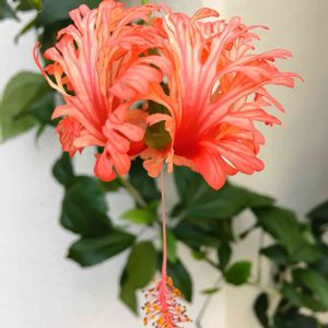 フリルが可愛いフウリンブッソウゲ💕 コーラルタイプのハイビスカスのママだそうです。 ぶら下がってんだけど 空中浮遊してるみたいで不思議な魅力✨