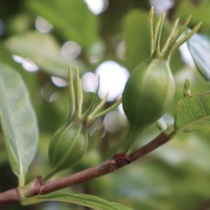 お友達の庭にクチナシ(梔子)の実がなっている木が二本あります。 お正月の栗きんとんの着色、染料に使われます。 実がなるのは一重咲きの花がなる木です。