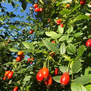 こんにちは。 たわわに実ったローズヒップ(薔薇の実) 薔薇は全く無知なので 薔薇の種類はわかりません(^_^*) さわやかな秋晴れの陽射しを受けて 赤い実がキラキラ✨と美しい♡