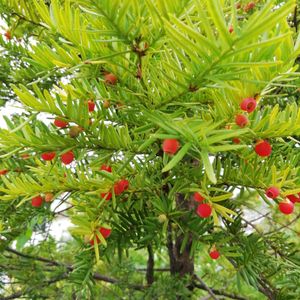 おんこの実が赤くなりました。たくさん実っています。 暑かったのが、良かったみたいで、黄色に枯れそうに弱っていたのですが、元気になりました。剪定はまだ出来ないのでボーボーですが。😅😅😅