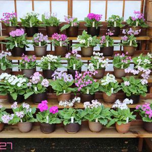 今日のお花 サクラソウ(桜草) 以下、説明書きより 「桜草花壇」 間口1間(1.8m)、奥行5尺(1.5m)の組み立て小屋に、5段の棚を作り、サクラソウの鉢植えを33鉢~36鉢並べたものを「桜草花壇」と呼びます。花色の配置も決められていて、隣り合う鉢の花色が重ならないようになっています。まとまった鉢数を並べることにより1鉢1鉢が互いを引き立て合う効果的な陳列方法です。 天保時代(1830年~1843年)に著されたサクラソウの専門書「櫻草作傳法」には鑑賞方法としてこの桜草花壇の陳列方法が書かれています。 江戸時代、日本の園芸植物は栽培方法から鑑賞方法まで確立され、世界的にもその水準は非常に高いものでした。 桜草花壇の花色配置 裏紅 白 染出 裏薄 裏紅 白 染出 染出 裏薄 裏紅 白 染出 裏薄 裏薄 裏紅 白 染出 裏薄 裏紅 白 白 染出 裏薄 裏紅 白 染出 染出 裏薄 裏紅 白 染出 裏薄 裏紅 横浜市 こども植物園にて 📷:2018.04.21