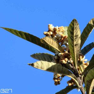 今日のお花 ビワ(枇杷) 今年の元旦の撮影です 高い位置の花を快晴の青空バックで 散歩道にて 📷:2021.01.01
