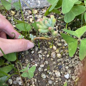 実家の隅っこに生えてるこの子。 お名前はなんという多肉ちゃんでしょうか?ちなみに、周りの草抜いてよ‼︎ って母に言ったら、このクローバーみたいなの、草じゃないそうで😬わからない、素人には、、、