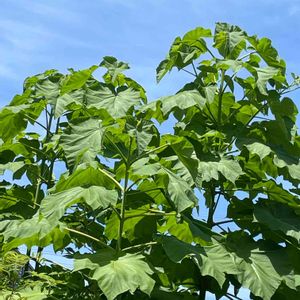 桐 たぶん桐かな…? 大好きな桐 実家の庭に突然生えてあっという間にこの高さ。春のお彼岸にはまだ半分ぐらいで葉っぱも綺麗でした…