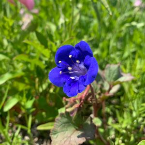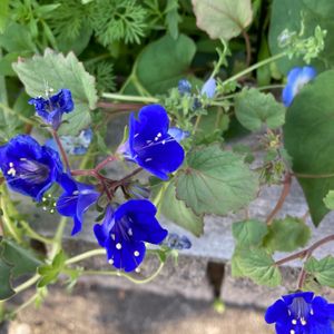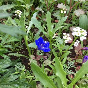 ①お花畑の中の可愛い子♡ 教えていただきました。ファセリア・カンパヌラリア♡別名ブルーベル、砂漠の鈴♪というそうです。こぼれ種からの発芽かと思っていましたが、霜に弱く乾燥を好むそうで、国内では厳しいそうです。ココに咲いてるのは?こぼれ種のような気がしますが…ほんとに美しい深いアオイロでしたよ。