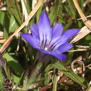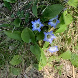 5/4 雪国植物園 おフデちゃんに、会いた〜い‼️。と思いながら、アッチコッチに行ったけど、会えないまま、今に至る。 ✌️✌️✌️😃😃😃✌️✌️✌️ おフデちゃん⁉️、おハルちゃん⁉️・・・おハルちゃんでしょうネ。一輪咲きです。⬇️ア〜、コレがおハルちゃんの根生葉なのか〜。おハルちゃんなら、初見です。 ハルリンドウ(春竜胆)リンドウ科リンドウ属の冬型一年草。姿形はフデリンドウとソックリ、双子みたいです。マァ、どっちでも、両方とも可愛い💕。 ✌️✌️✌️😃😃😃✌️✌️✌️ 山野草の小さな一番星。色良し、形良し、素敵です。