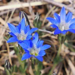 ハルリンドウ(春竜胆) リンドウ科リンドウ属の越年草 春に咲く、明るい空色のリンドウが、 湿地に、ポツポツ咲き始めていました。 晴れている日に、花は開きます。 らせん状に萎んだ花も蕾も、味わいがあります。 茎は、基部で分かれて、 ひとつの茎の頂に、ひとつだけ、 花がつきます。 これから、季節が進むと、湿地は、ハルリンドウの色で、もっと、華やかになります😆