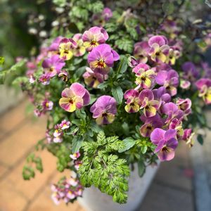 こんにちは☀️ 今日も朝から晴れています。 今朝は氷点下になったようで、庭の地面が少し凍ってました😅耐えられる最低気温が0度くらいのものは、傷んで赤く変色しているものも😅 昨日の夜から昨日載せたマーガレットと他のマーガレットは玄関に退避させていたので無事でした。 今日の投稿picは、冬の寄せ植え第5弾。 寄せ植えの内容は、 ☆フリル咲きビオラ ‘’シャルロット‘’ (買った時の色とは変わってしまいました) ☆ダイアンサス パープルウェディング (色合いが綺麗だったので、だいぶ前に買ったものです) ☆デージー ‘’バンバンローズ‘’ .(実感無いですが、花が大きめなデージーらしいです)