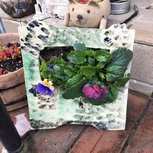 パンジービオラの寄せ植えです😊 真ん中にピンクのチューリップ🌷の球根が、入ってます。春まで、少し隙間が空いてしまうので、かわいい、お客さんにすわってもらいました😊