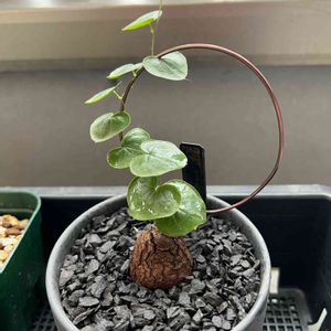 アフリカ亀甲竜ディオスコレア エレファンティペス 4月14日種まき 根っこが出て ハート♡の葉っぱがでたよ💕 白い丸いところが塊根になるのかなぁ〜?