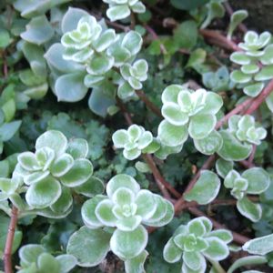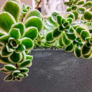 「斑入りマルバマンネングサ」 1月9日am10:45頃 ✧p📷qω•,,´)パシャ✧ 何となく可愛い斑入りマンネングサ🥰 増えてふた鉢になった🎶 葉っぱの縁が白いのと、葉っぱ全体が白っぽいのがある。 それが妙にアクセントになって良い感じ🎶