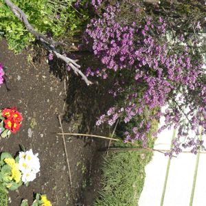 花壇 上はアリッサムも よく咲いてた時です。 下はピンクのストックをカットしました。 チョコレートコスモスが場所が悪かったのか 咲かなかったから抜いてルピナスを植えました。アリッサムは昨日 咲き終わりを整理しました。 チュウリップの芽が出だしてます。