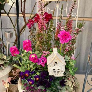 ピンク系の寄植え🐈🐾 💚💜💖💚💜💖💚💜💖 金魚草とエリカ、 八重咲きストック、 アネモネ、ビオラなど