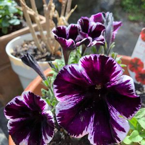 ペチュニアがたくさん咲き始めました(╹◡╹)避難しています。 隣は🐕が噛んじゃったハイビスカス🌺無事を祈るばかりです💕