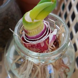 赤ネギだす 料理に使った残りを水栽培してみたものです😅 単なる、気紛れです😅 葉っぱが育ったら、炒めものに出来るかなあ?