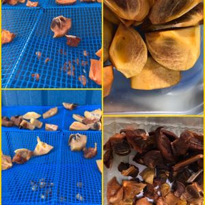 こんにちは(*´ω`*)ノ))〜 今年は富有柿が豊作なのと、息子が 取り引きから筆柿を貰って来たので 柿チップを作っています。 柿チップは昨年の10/28日の nakamu-さんの投稿で知りました。 うちのは種ありなので、スライスしにくい んだけど、日に干して水分が抜けてくると 種も取れます。 右上が生の筆柿(半分から上) 富有柿(半月から下) 右下が柿チップにしたもの たくわんみたいな食感です。 確かにハマります。