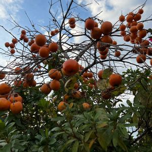柿の木 干し柿に最適な形の渋柿です 20年ほど前に義父が富有柿を 接ぎ木同じ木に2種なります 今年は沢山成ってます 手前の丸いのが富有柿 奥の小さめのが渋柿です