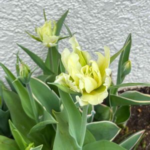 チューリップ シネダブルー タグはもっと紫っぽかったんですけど🤔 ちょっと黄色みがかってもいるかな? 4〜5月開花予定の球根が咲いちゃっています
