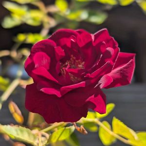 🏷真っ赤な火曜日 前に元部下の女の子から貰った香椎花園の赤いつるバラが咲いています このバラは水平以下に誘引すると枝枯れするので、サボテンの日除けを兼ねて高く誘引しました おかげで空高く咲いて、目に付かないのが難点です