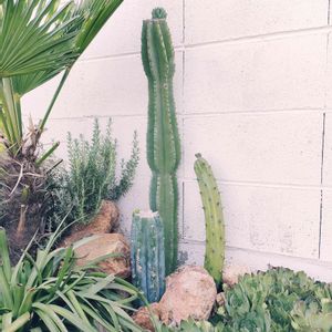 昨年地植えした柱サボテン(2023.08pic)。冬季は鉢上げして室内で過ごし、春に戻しました🌵 途端にですね、3本すべて頭にポコっと子株が👀 昨年はいきなり花が咲いて驚きましたが、ここの環境がとても気に入っているということを改めて確信。