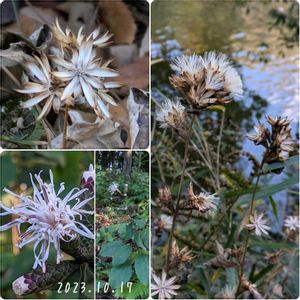 (追記10/18) 残念ながらコウヤボウキではなくカシワバハグマの可能性が高いです 同じキク科コウヤボウキ属ではありますが、植物学者ではないので確定は避けます😂 昨日の夕方の散歩はとても興奮した🤩💗 💜コウヤボウキ(高野箒) まだ蕾も幾つかあってとても新鮮💚 辺りをよく見たらそこここに数本見つけた GSのいくつかの投稿で時折見かけ 会いたくてたまらなかったコウヤボウキに やっと出会えました 🥰💜🥰 時々通る暗めの谷間の北斜面で⛰️ 私がここは山野草の宝の山だわ!と かねてから思っている場所に🫢 今までなぜ気がつかなかったのだろう? wikiより) 和名「コウヤボウキ」は、和歌山県の高野山で茎を束ねて箒の材料としたのでこの名がある。玉箒(たまぼうき、古くは「たまははき」)と呼ばれて古くから箒の材料とされ、正月の飾りなどにもされた。正倉院にある宝物の一つである子日目利箒(ねのひのめとぎぼうき:儀式用の玉飾りの箒)はコウヤボウキを材料としたものであることがわかっている。
