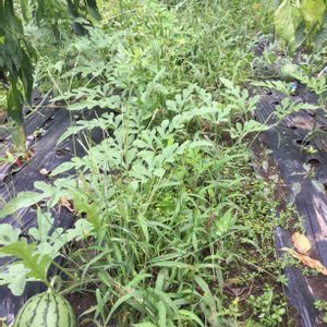 畑の通路にスイカごろごろ。草取り間に合ってないけど、かえって保護色になって結果オーライ❤️。