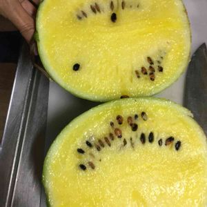 じゃじゃーん^_^ 小玉スイカの黄色玉! 甘くて美味しい😍。 赤と黄色を並べて植えたせいで、 割ってみるまで色が分からないのですが、美味しいです。