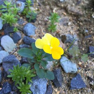 雑草かなと思ってたらビオラでした。 春に置いてた鉢からこぼれた種です。ちっちゃいのに黄色ですごく目立ってます。