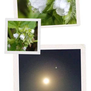 荏胡麻の花 紫蘇に似たぷちぷちの可愛らしい花です✨ 今年は、荏胡麻の葉の醤油漬けを思う存分味わいました😋 (紫蘇の葉っぱでも、美味しい🥰) 夜明け前 名残りのハンターズムーン🌕