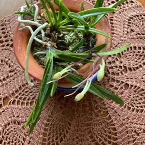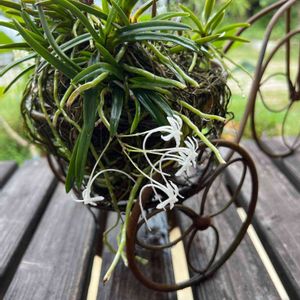 フウラン 風蘭 ①②庭にて、お花咲きはじめました☺️✨③蕾も沢山、楽しみです♡ 数年前から家族から引き継ぎ育てているもの。 とはいえ、春先の植替えだけ頑張り(今年は植え替えすらせず)木の枝にぶら下げ、春から開花期の乾いたら水やりだけ気をつけて後は自然におまかせです😆💦