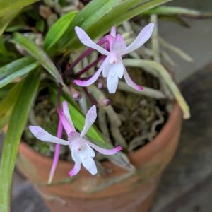 🍀フウラン・風蘭🍀 かわいいフウランのお花が咲き出しました。💕🤔🎶🎵 わりと日当たりのいい所に置いているので葉っぱの色は悪いですね〜😅💦💦💦 蕾もまだ沢山あるので楽しみ、楽しみ💕💕 🏷白い貴婦人✨️ 🏷金曜日の蕾たち 🏷蕾応援団 🏷放ったらかし隊 に参加させて下さいね。