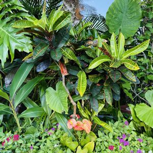 沖縄旅行3 ホテルエントランスの植栽🌴 クロトン、アンスリウム、カラジウムなど、観葉植物で馴染み深い植物たちが、外で活き活きと茂ってる✨ 外に植えられている熱帯植物たちを見るのも、沖縄旅行の楽しみのひとつです😊