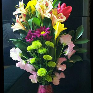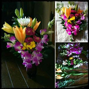 一部花が悪くなってきたので組み直しをしました。 百合、デンファレ、スプレーマム を新たに足しました。 大菊、フリージア、スプレーマム ビシャコ は再利用。 デンファレ10本が250円… 迷ったけれど、安さには勝てず購入(・・;φ テーマは…特になしです(笑)