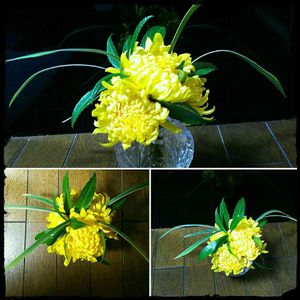 昨日作った黄色の大菊5本使ったアレンジ。 家にある花材を使ってラウンドブーケ💐風に。
