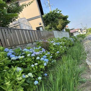 今朝の🚲💨で... 今朝は少し遅く成り6時半ともなると☀️ガンガン🥵 屋代線(やしろせん)廃線後の遊歩道、家に無い色の紫陽花を楽しみました♪ 咲き始めの淡いブルーが涼しげです。 家の紫陽花、ピンク系ばっかり昨年それなりの肥料を施したりしたけど、変わり無し‼️ 今年は何もせず楽しんでいます♪ 酸性の土だとブルーに、花後に1鉢をブルーベリーの様に鹿沼土だけに植え替えようと思っています。 3枚目の写真、見切り品100円がこれだけの色合いが楽しめるので、良しですね😆 4枚目は裏のホンダカーズから3年前に1枝を貰って挿し木、昨年も可愛い色合いのピンク、今年は少し薄いピンクです。 1つの花が3.5㎝ほどと大きいです。 品種名は分からずです?