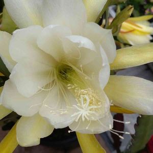 クジャクサボテン 今開いたばかりだよ だから蕊がまだ伸びきってないもの 初々しい、生まれたてホヤホヤ😃 純白の花、素敵‼️