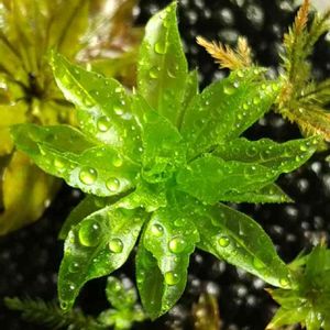 教えて貰った、アプリ拡大鏡&顕微鏡で、最近、開き始めたカサゴケを撮って見ました。 色合いが暗くなってしまったので、少し加工で明るくしました。 水滴がレンズのようになっている様子が分かります。