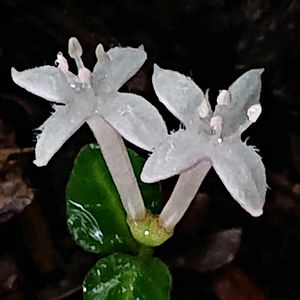 ツルアリドオシ(蔓蟻通し) アカネ科 ツルアリドオシ属 名前の由来 葉や花がアリドオシに似ている アリドオシの名前の由来 木にあるトゲが蟻🐜まで刺し通すという事から アリドオシは常緑小低木で、ツルアリドウシは常緑多年草 花期6〜7月で、地面を這い長さ10〜30cm、北海道から九州の山地の林内に生える 1️⃣花冠の長さは1.5cm、漏斗形の白から薄ピンク色で、先端が4裂 花の大きさは1cm 雌蕊は1個で先が4裂し、雄蕊は4個 異形花柱性(いけいかちゅうせい)の花で、雌花の長い長花柱花と、雌花の短い短花柱花がある これは自家受粉を避ける為だとされる こちらは雄蕊が長いので短花柱花だと思います 内側に毛がある 2️⃣花は茎の先から2個咲き、果実は2個の子房が合着し、一つの果実になる 萼の跡が二つある豚の鼻🐽のような赤い果実になるようです 3️⃣長花柱花だと思います 雌蕊が長く突き出ています 2個ペアーの花になり、子房が2個くっ付くというとこは種が一つの果実に多く入るので、鳥さんにより多くの種を運んでもらう戦略でしょうか? ちなみに同じように2個〜1個咲くアリドオシの実は合着せずに2個できるそうです
