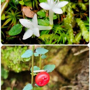 このお花に会わないと何か忘れ物をしたような気分になる。 花友さんの投稿を見ていつもの山に。 ①初めてこのお花知ったのはGS。 可愛い山野草、何処で会えるのかあちこち探してやっと会えた。 ②こんなに小さなお花、もし会えていたとして気づかなかったかも。 ③左上の白い小さなお花がキッコウハグマ。ツルリンドウと比較。 ④⑤近くではツルアリドオシの赤い実がキラキラ。 みんな苔の上で心地良さそうですね~🥰