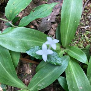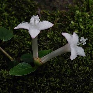暗い林内の山道で咲いています。 ツルアリドオシですね。 花の大きさは8ミリ位のラッパ状。ちっちゃくて可愛いらしい花。 どの花を見てもペアで咲いている。