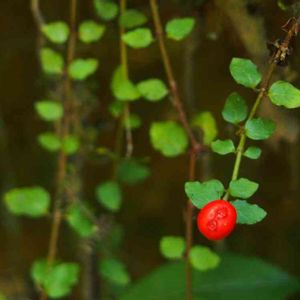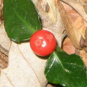 蔓蟻通し 花 5月〜6月 実 9月〜12月 常緑性の多年草。低山や亜高山の木陰に生える。葉身は深緑でつやがあり、厚くて毛が無く、卵形で先端は短く尖り、基部は丸い。また、辺縁はやや波打っている。 果実は熟すと赤くなり、丸くて径8 mm。果実は合着した二つの子房がまとまった形で膨らんだもので、左右2個の花のガクの痕が表面に残る。