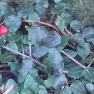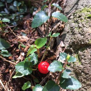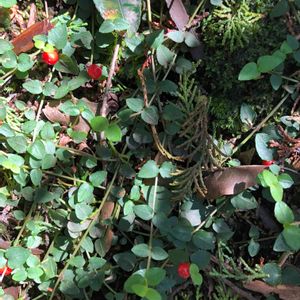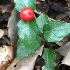 新津丘陵 10/25 これも、足元の赤い実。ツルアリドオシ(蔓蟻通し)。地面を這う常緑蔓性の多年草。ヤブコウジとそっくりですネ。葉にギザギザは無く、少し波打ちます。・・・しっかり、覚えておこっと‼️。 花を見た事がありますか⁉️。いつも二つセットで、咲いていますネ。そして、二つで一つの実をつけます。実をよく見ると、花の跡が二つ有ります。どこか不思議ですネ😃😍❤️。