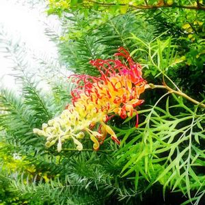 晴れた日は 青い空から 幸せがたくさん降ってくる 街に出逢う花 彩る落ち葉 心をときめかせる 踊る秋が 満ちてくる 弾むように 街を闊歩する 広場のスクリーンから 流れるリズムに 街のさざめきも 音符が踊るようにキラキラ 出ておいで ここにおいで 躍りながら待っている 弾む幸せの光の中へ 🍂グレビレア 素敵な花ですね🎵 たでくう さんに名前を教えていただきました。有難うございました😆💕✨ グレビレアは、オーストラリアからパプアニューギニアにかけて分布しているヤマモガシ科グレビレア属の常緑低木~高木です。この属には250種以上もあり、主に鉢物用に低木性の種類がたくさん導入されています。花は、とても変わった形をしていて、一般の花のイメージから少しかけ離れています。 半耐寒性で、種類によって耐寒性にも幅がありますが、総じて、霜に当たると傷みますので通常は鉢植えでの栽培になります。