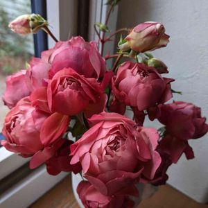 3日にカットした蕾ちゃん💕 咲いてきました🌹✨ ペネロープのお花も最後です カットしたお花たちで華やかな窓辺…嬉しい😄💓 999pic❣❣ さあ!明日はいよいよお楽しみ会ですよ〜😁✨✨✨ ((o(´∀`)o))ワクワク💓