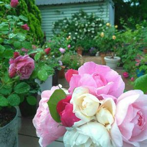 あっちもこっちも咲いてバラ園状態です(〃∇〃)💕 ピンクグラデーションのブーケ💐のリクエストをいただきました💖(ゆうさ〜んどうかしら😁) メアリーローズ セプタードアイル ナターシャリチャードソン マダムアルフレッドキャリエール デプレアフルールジョーヌ あおい キングジョージ4世 あと、お気に入りのデッキからの眺めです💖