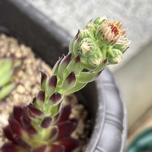 おはようございます😊 今日の天気 曇り時々晴れ 最高気温31℃の予報です 今日は2枚投稿しますね💕︎ 1️⃣センペルビウムのタワー⁉️🗼 いつの間にか ビューンと伸びちゃった\(//∇//)\ お花らしき物も見えます👀 この後どうしたらいいものか わかりませ〜ん😅 少しの間 かわゆい姿を見て ꉂ🤭︎💕うふふ 2️⃣先日 山野草展示販売会で 紫陽花をお連れして...あっ😂この子も一緒にと連れてきました 斑入りのミセバヤです....ふつーのミセバヤはありますが 斑入りがなかったので 思い切って🤣 育ててみますね☺️ 明日は七夕🎋✨🍧ですね 早い 早い😂 それでは 良い一日をお過ごし下さいね へばね😊👋