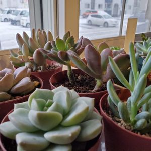 今日は雨☔の予報なのに、日向ぼっこが出来るほど、いいお天気☀ 最近、『スゴイ増えたな!』と言う子ども達の声が聞こえて来る。 少しでも…と思い寄せ植え作戦🙋第1段、まずはパキフィツム達、お気に入りの鉢に整列して可愛くなりました💞 他にも寄せ植えてしてスペース縮小する事で少く見せたいけど、似合う鉢が見当たらない😰…今日は出掛けないつもりでお化粧もしてないのに、天気もいいし出掛けたくなってきた…葛藤中😣